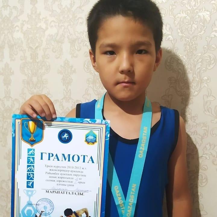 Еркін күрестен 2010-2012 жжылы туылған жасөспірімдер арасында Райымбек ауылдық округінің ашық жарысында 23 кг. салмақ дәрежесінде І орын алғаны үшін марапатталады.