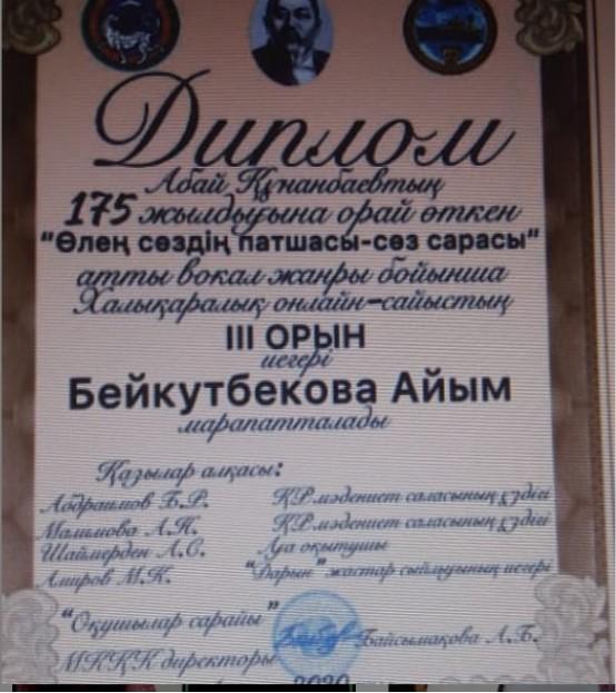 Абай Құнанбаевтың 175 жылдығына орай өткен «Өлең сөздің патшасы- сөз сарасы» атты көркемсөз жанры бойынша Халықаралық онлайн - сайыстан №3 жалпы білім беретін мектептің 7а сынып оқушысы Бейкутбекова Айым 3 орын дипломымен марапатталды. Айым, жарайсың