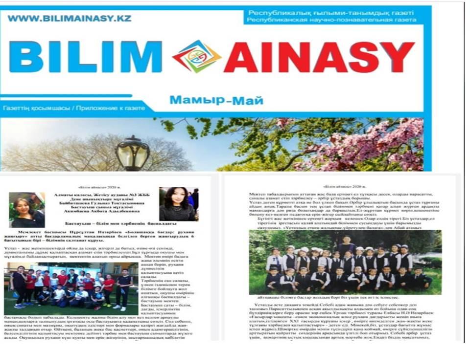 21 мамыр 2020 0 1 2 3 4 5 Г.Т.Байбатшаева, А.А.Акимбаева "BILIM AINASY" газетіне "Бастауыш - білім мен тәрбиенің баспалдығы" атты тақырыптағы мақала мамыр айында жарияланды.