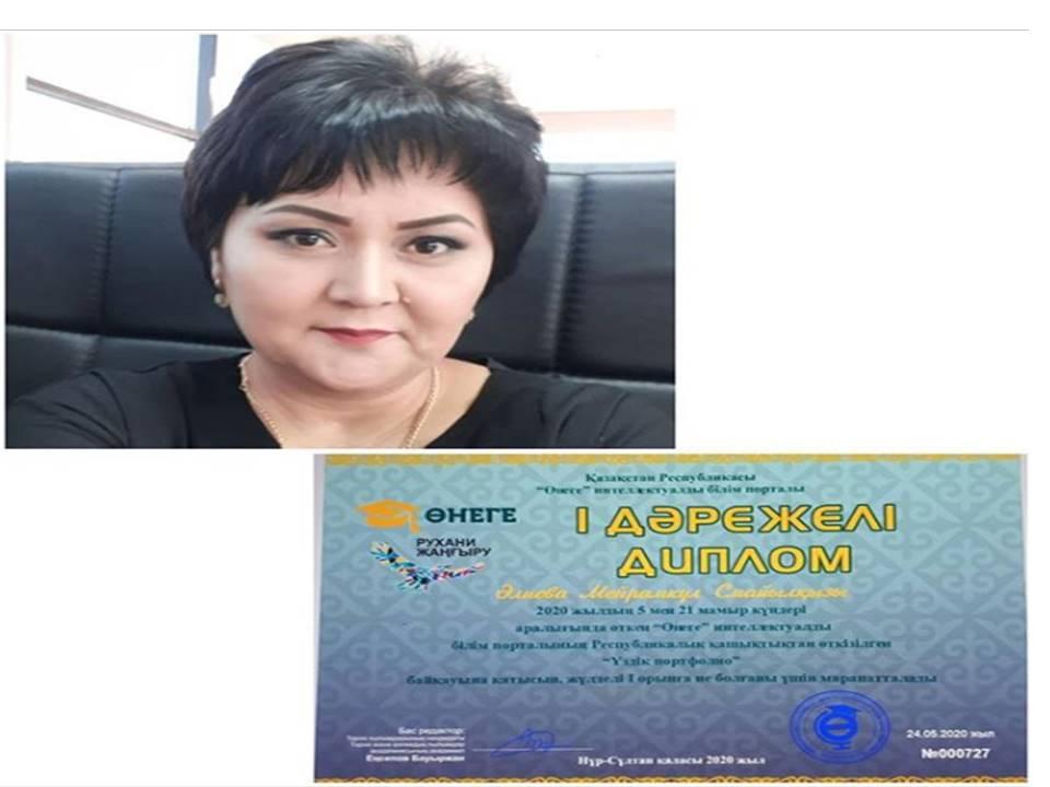 28 мамыр 2020 0 1 2 3 4 5 Қазақстан Республикалық"Өнеге" интеллектуалды білім порталы қашықтықтан өткізілген"Үздік портфолио" байқауына М.С.Әлиева қатысып жүлделі I орын алды.