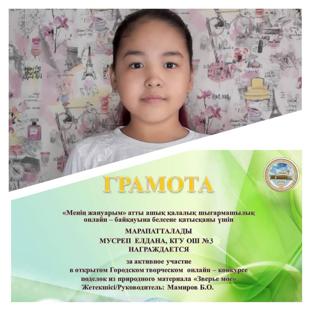 25 қараша 2020 0 1 2 3 4 5 "Менің жануарым" атты Алматы қаласы бойынша ашық шығармашылық онлайн- байқауы "Менің жануарым" атты Алматы қаласы бойынша ашық шығармашылық онлайн- байқауына белсене қатысқаны үшін МУСРЕП ЕЛДАНА марапатталды. Жетекшісі Б.О.Мамиров.