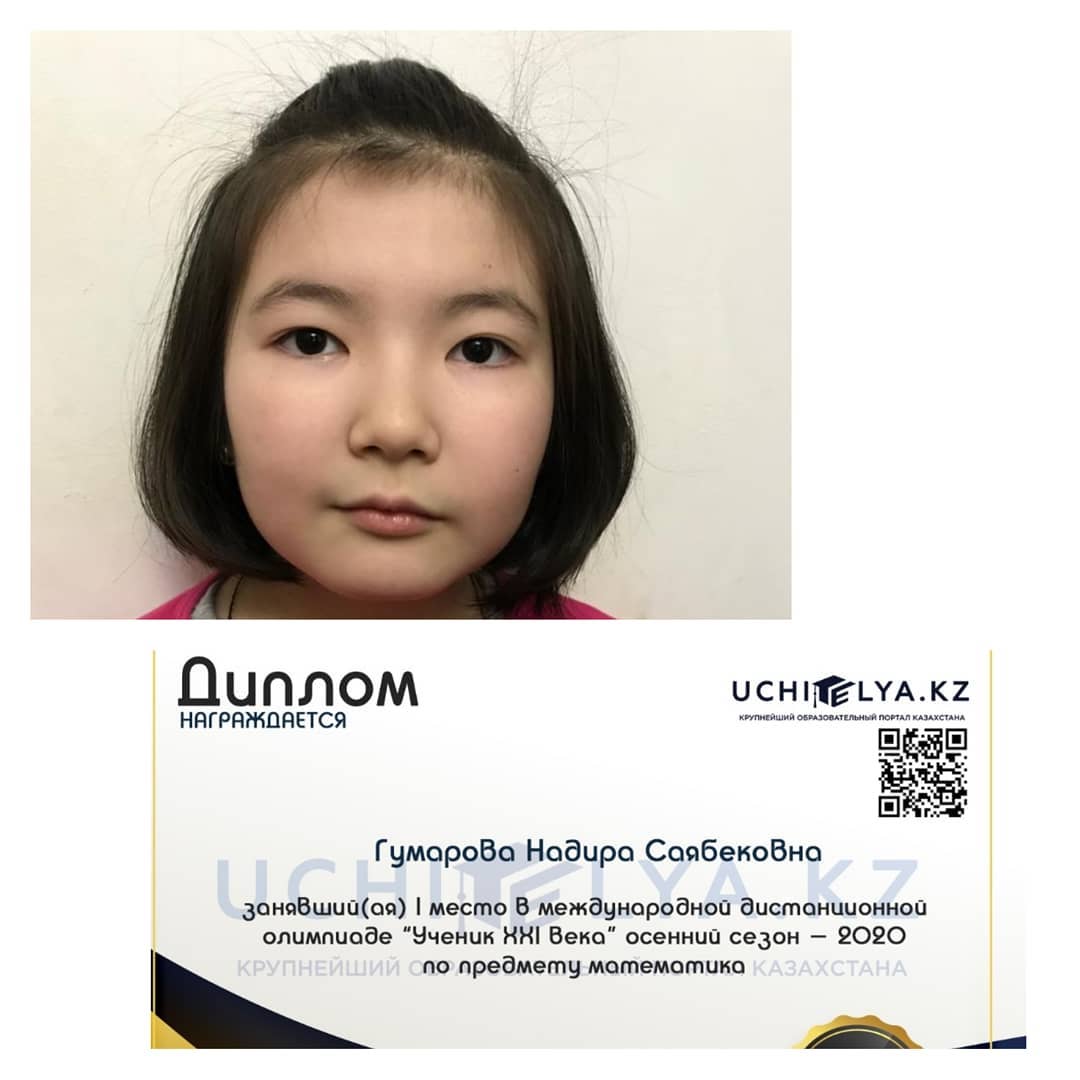 ИПЛОМ награждается НАДИРА ГУМАРОВА занявшая І место в международной дистанционной олимпиаде "Ученик XXI века" осенний сезон - 2020по предмету математика. Молодец! НАДИРА !