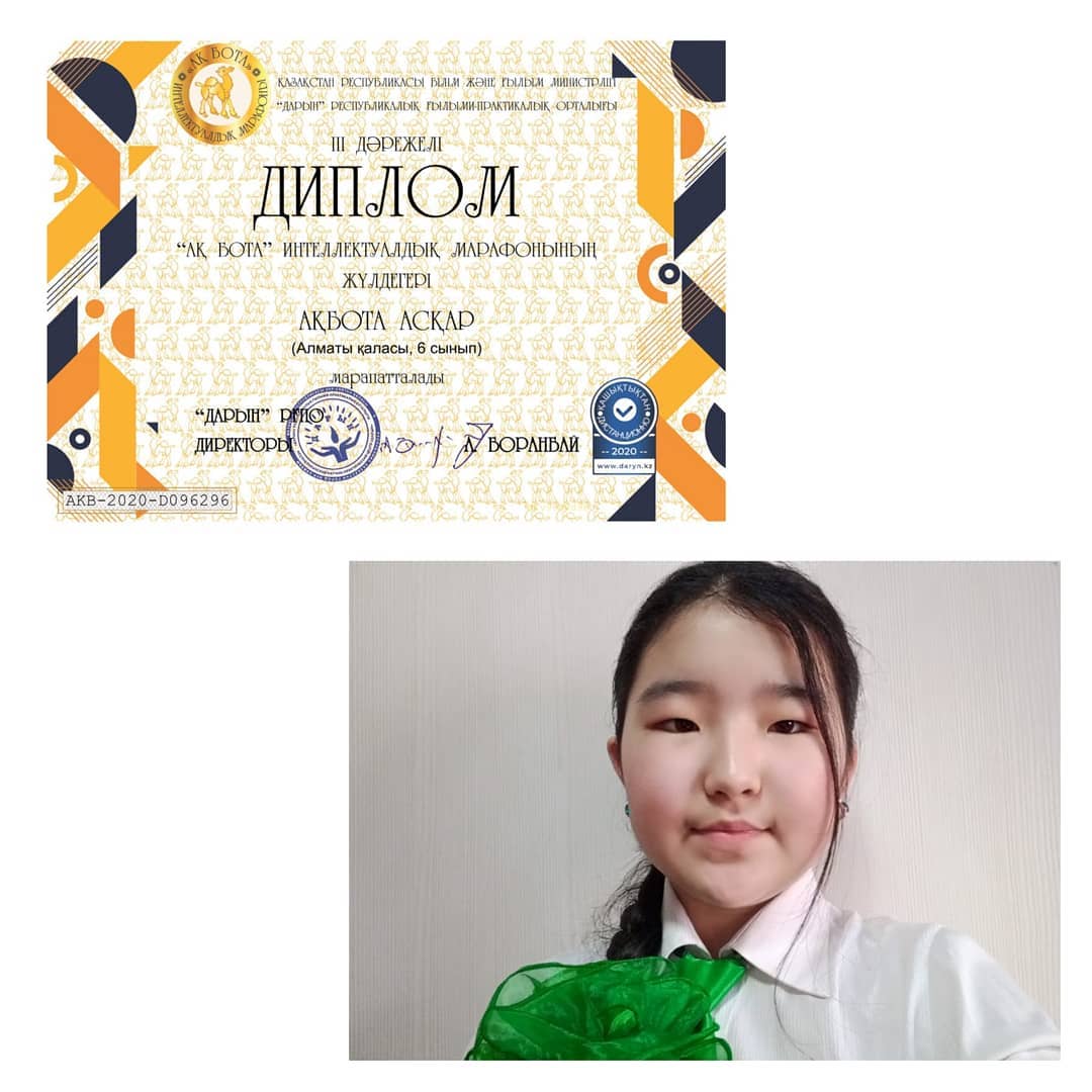 11 желтоқсан 2020 0 1 2 3 4 5 ІІІ ДӘРЕЖЕЛІ ДИПЛОМ "АҚ БОТА " интеллектуалды марафонының жеңімпазы АҚБОТА АСҚАР марапатталды. ҚҰТТЫҚТАЙМЫЗ!
