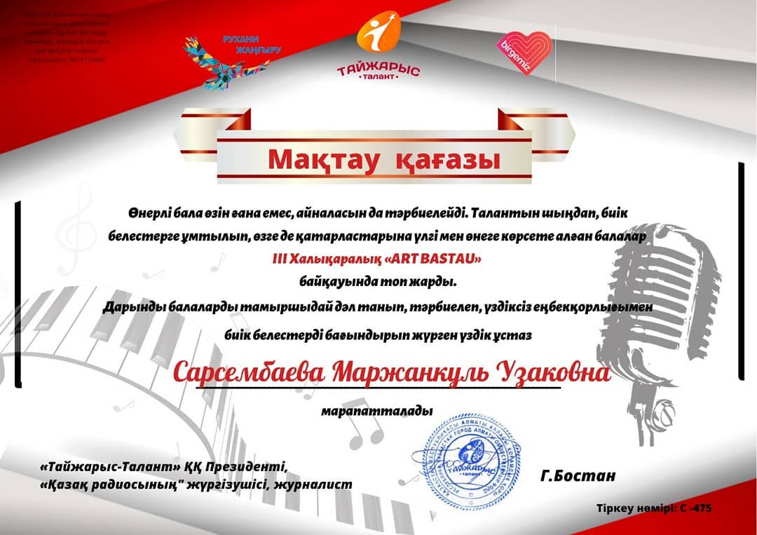 16 желтоқсан 2020 0 1 2 3 4 5 МАҚТАУ ҚАҒАЗЫ САРСЕМБАЕВА МАРЖАН УЗАКОВНА ІІІ Халықаралық "ART BASTAU" байқауында дарынды оқушы дайындағаны үшін марапатталды.