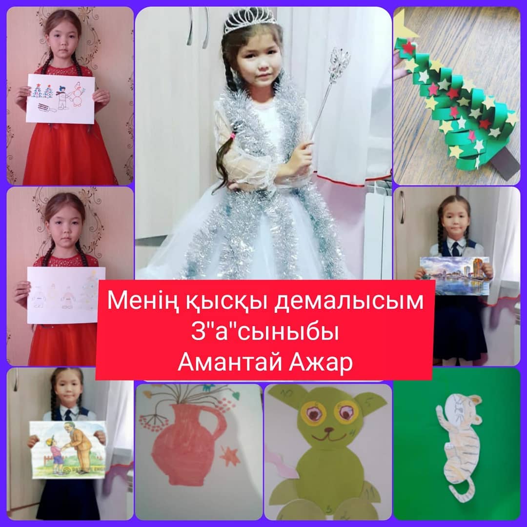 3а сынып оқушысы Амантай Ажар қысқы демалысын қызық өткені туралы фото арқылы баяндады. Ажар ертегі кітап оқығанды, сурет салғанды және қолөнермен шұғылданғанды да жақсы көреді. Ажар сабағын да өте жақсы оқитын алғыр,зерек оқушы.