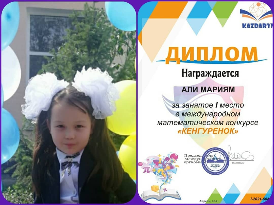 30 сәуір 2021 0 1 2 3 4 5 ДИПЛОМ награждается АЛИ МАРИЯМ за занятие I место в международном математическом конкурсе "КЕНГУРЕНОК".
