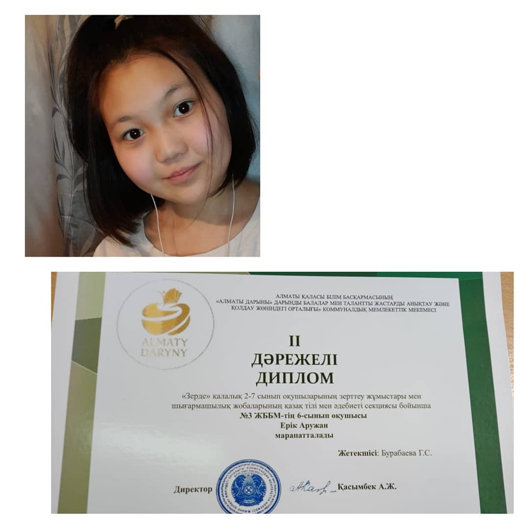 30 сәуір 2021 0 1 2 3 4 5 ІІ ДӘРЕЖЕЛІ ДИПЛОМ ЕРІК АРУЖАН"Зерде" қалалық 2-7 сынып оқушыларының зерттеу жұмыстары мен шығармашылық жобаларының қазақ тілі мен әдебиет секциясы бойынша марапатталды.Жетекшісі Г.С.Бурабаева