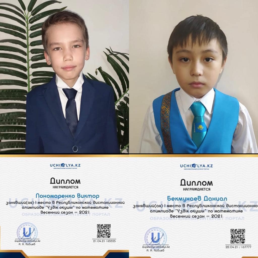 30 сәуір 2021 0 1 2 3 4 5 Диплом Награждаются Пономаренко Виктор, Бекмухаев Даниал Занявшие I места в Республиканской дистанционной олимпиаде "Үздік оқушы" по математике.