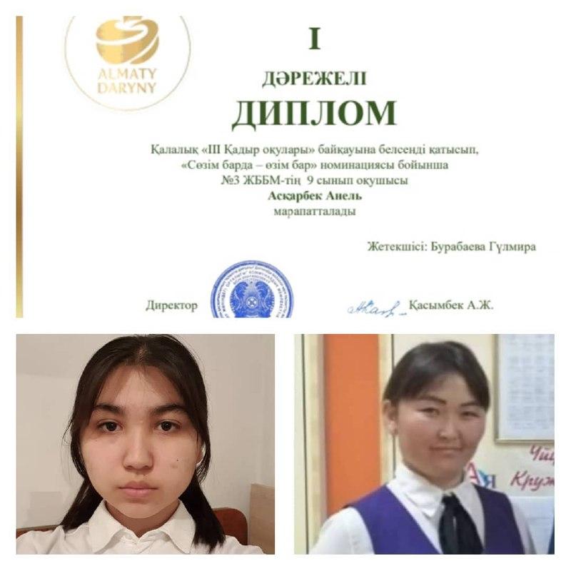 12 мамыр 2021 0 1 2 3 4 5 I ДӘРЕЖЕЛІ ДИПЛОМ АСҚАРБЕК АНЕЛЬ Қалалық "ІІІ Қадыр оқулары" байқауына белсенді қатысып, "Сөзім барда - өзім бар" номинациясы бойынша ALMATY DARYNY орталығының директоры А.Ж.Қасымбек марапаттады. Жетекшісі: Г.С.Бурабаева.