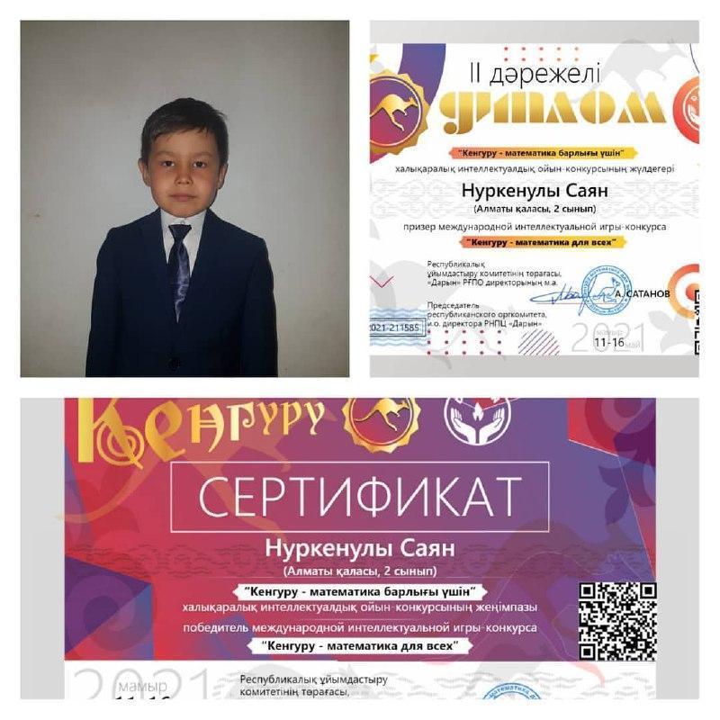 22 мамыр 2021 0 1 2 3 4 5 ІІ ДӘРЕЖЕЛІ ДИПЛОМ НУРКЕНҰЛЫ САЯН Кенгуру - математика барлығы үшін.Халықаралық интеллектуалдық ойын - конкурсының жүлдегері.ҚҰТТЫҚТАЙМЫЗ, Саян тек алға!