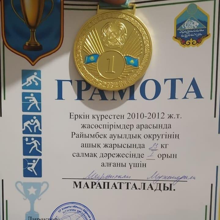 Еркін күрестен 2010-2012 жжылы туылған жасөспірімдер арасында Райымбек ауылдық округінің ашық жарысында 23 кг. салмақ дәрежесінде І орын алғаны үшін марапатталады.