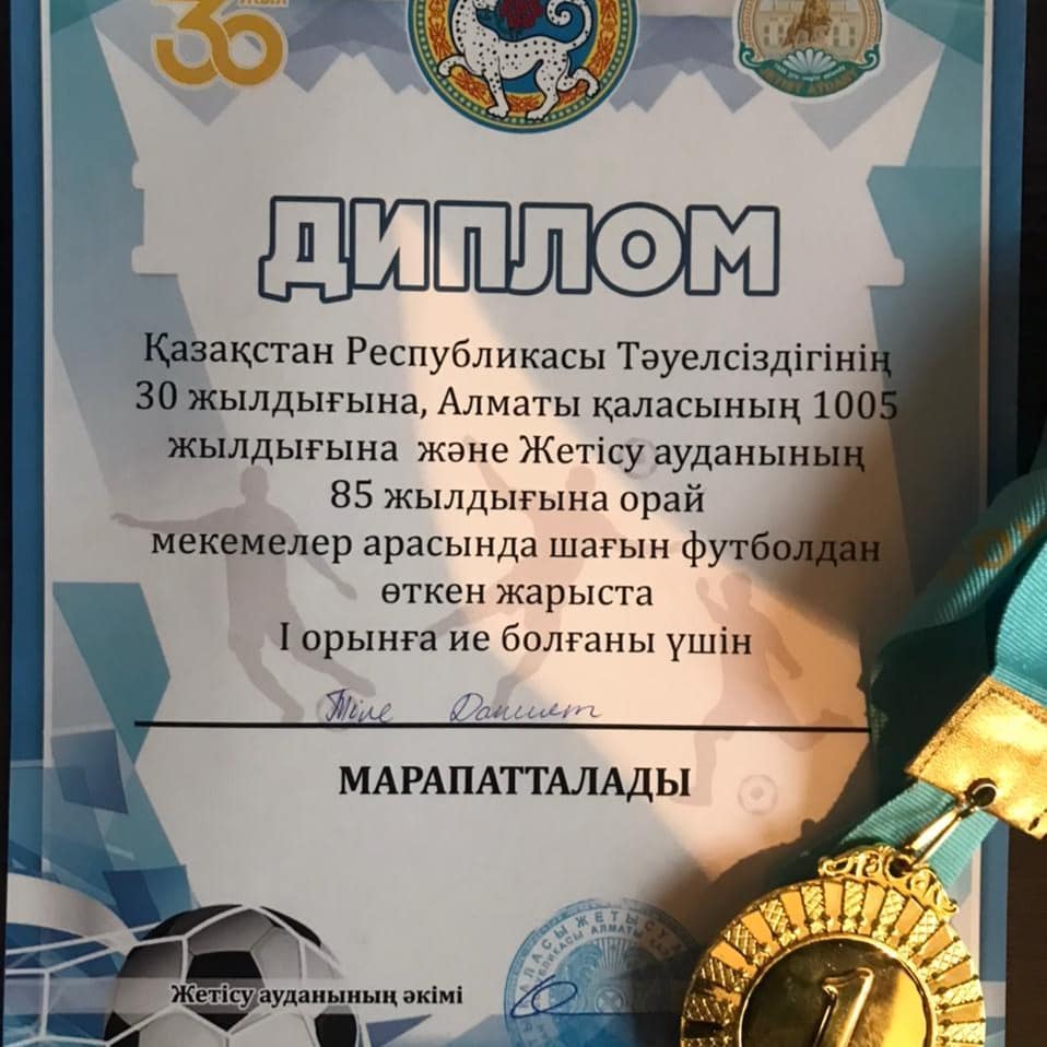 Қазақстан Республикасы Тәуелсіздігінің 30 жылдығы, Алматы қаласының 1005 жылдығы және Жетісу ауданының 85 жылдығына орай мекемелер арасындағы шағын футболдан Жетісу ауданының мұғалімдер командасы I орынға ие болып, мектептің дене шынықтыру пәнінің мұғалімі ТЛЕ ДАНИЯТ грамотамен марапатталды. ҚҰТТЫҚТАЙМЫЗ!
