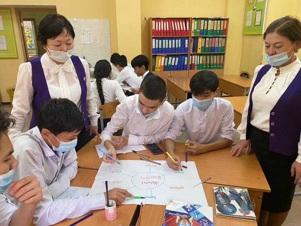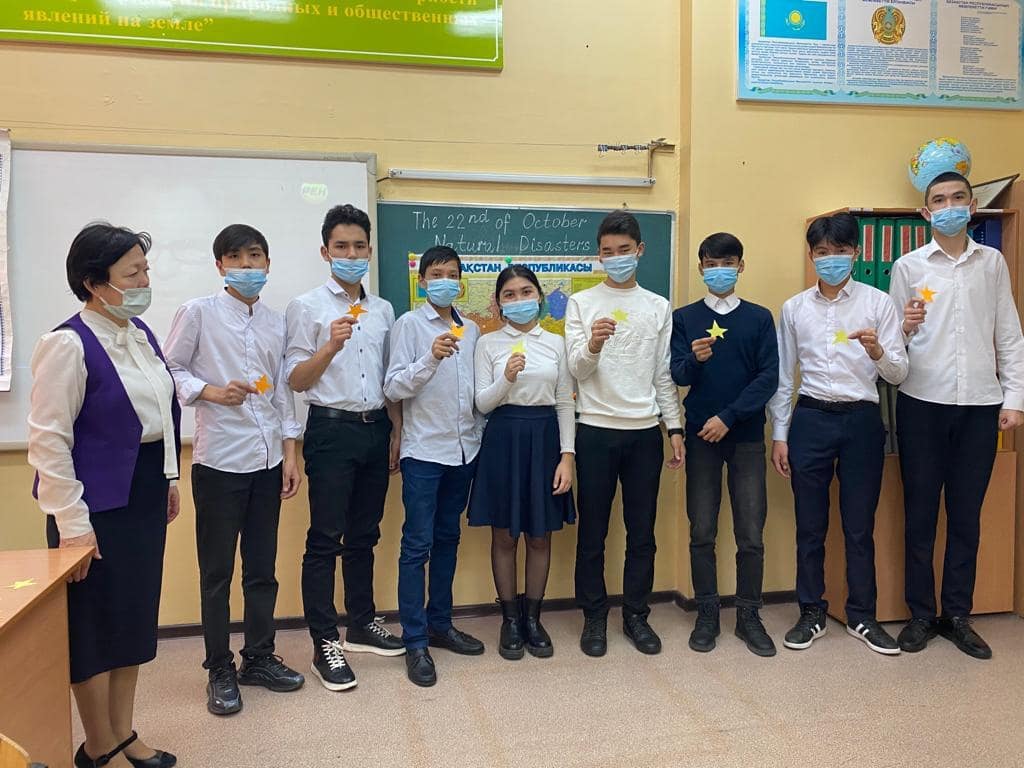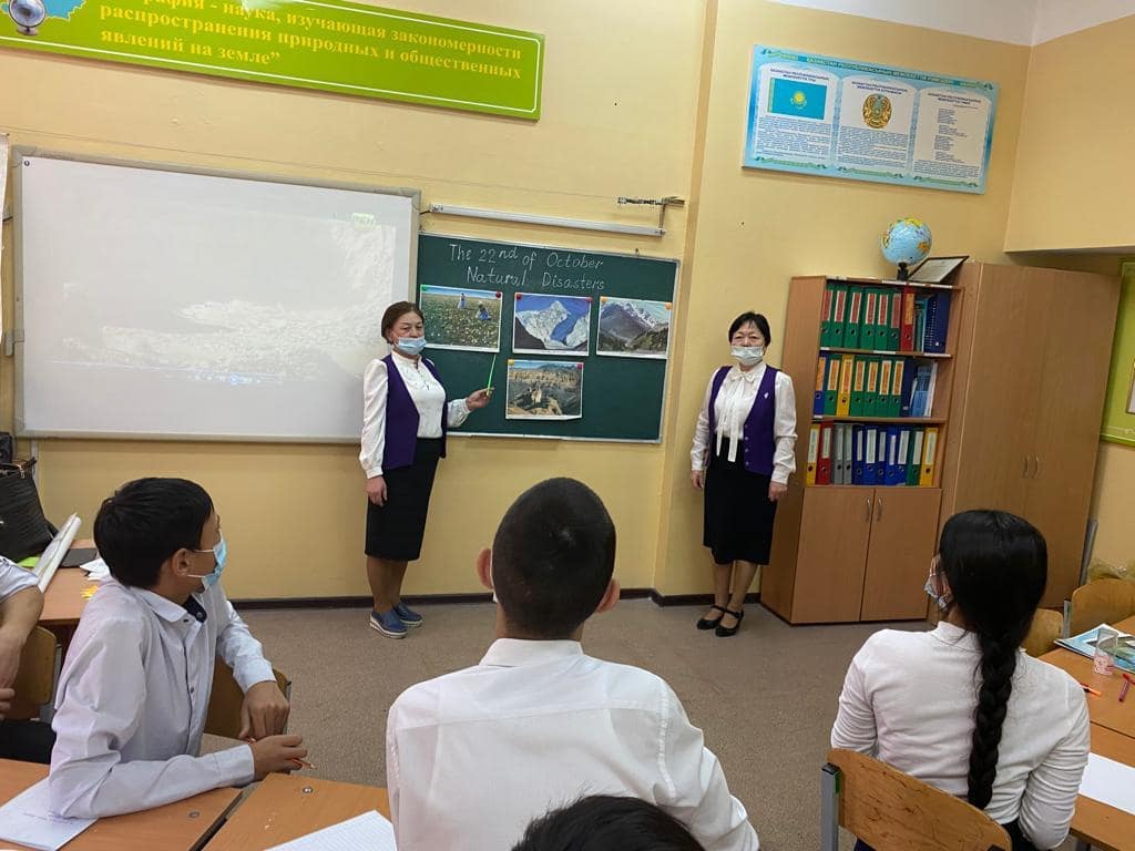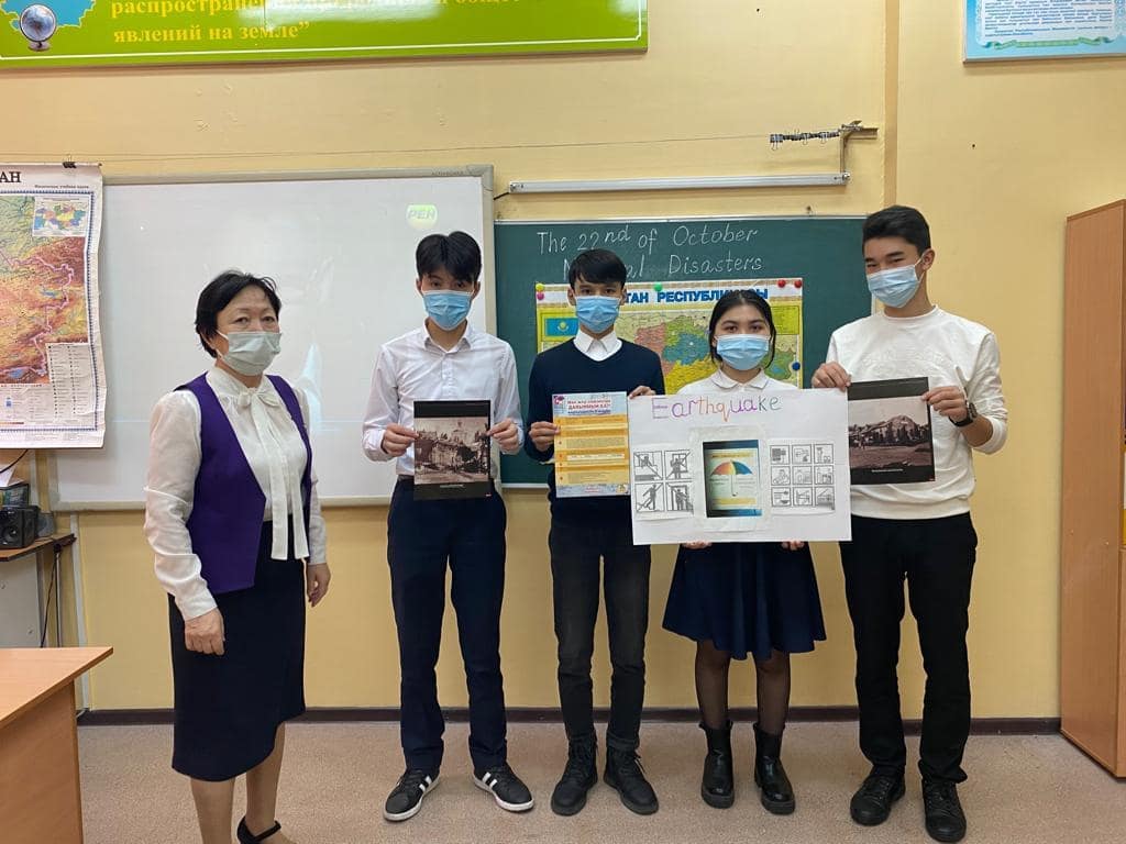 The teacher of English Kabdoldina Kulsim and the teacher of Geography Taskenbayeva Farida held an integrated lesson on the theme" Natural Disasters" with the grade 10a. The aim of the lesson was teaching the pupils how to be safety during the natural disasters.