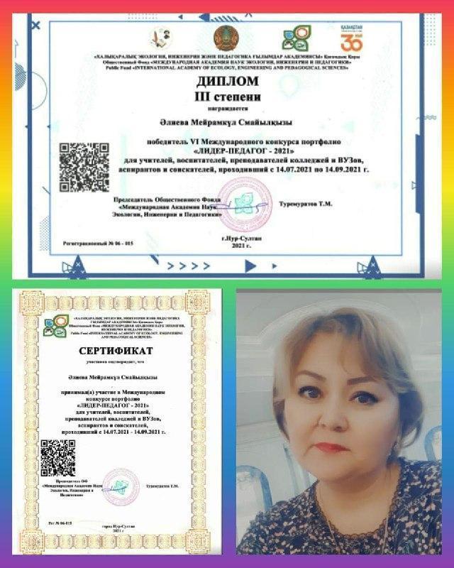 "ЛИДЕР-ПЕДАГОГ-2021" VI Халықаралық портфолио конкурсына қатысып III дәрежелі дипломмен ӘЛИЕВА МЕЙРАМКУЛ СМАЙЛҚЫЗЫ марапатталды.