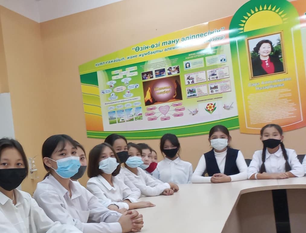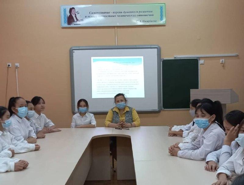 "Ұлттық тәрбие - ұлт болашағы" тақырыбында 7 сынып қыздары арасында сыныптан тыс тәрбие сабағы өтті. "Адамның әдептілігі мен мәдениет деңгейі оның сөйлескен сөзінен, істеген ісінен, мінез-құлқынан, жүріс-тұрысынан көрініп тұрады" - деп З.О.Атенова сөз алды.