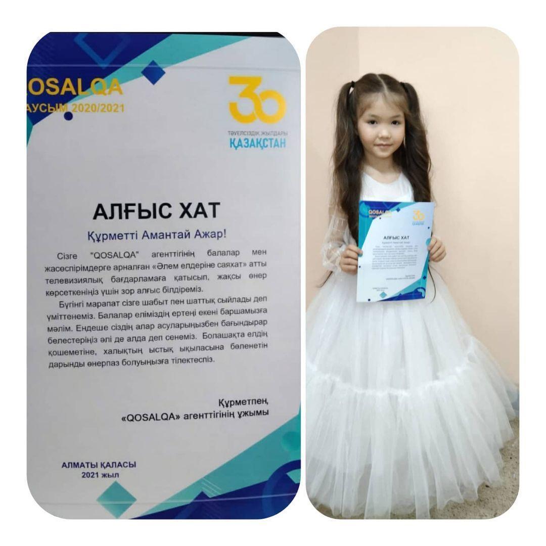 08 желтоқсан 2021 0 1 2 3 4 5 "Әлем елдеріне саяхат" АЛҒЫС ХАТ"Әлем елдеріне саяхат" атты телевизиялық бағдарламаға қатысып, жақсы өнер көрсеткені үшін АМАНТАЙ АЖАР марапатталды.