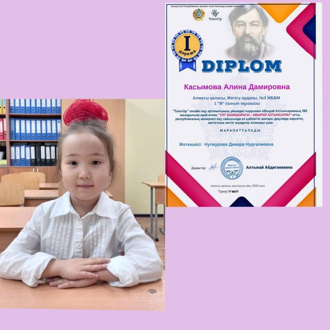 22 желтоқсан 2021 0 1 2 3 4 5 "Ұлт шамшырағы-Ыбырай Алтынсарин " 1 "ә "сынып оқушысыКасымова Алина ДамировнаЫ.Алтынсаринның 180 жылдығына орай өткен "Ұлт шамшырағы-Ыбырай Алтынсарин атты республикалық мәнерлеп оқу сайысында І жүлделі орынға ие болды.