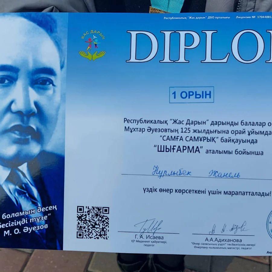 19 ақпан 2022 0 1 2 3 4 5 "Самға Самұрық" байқауы DIPLOM1орынРеспубликалық "Жас дарын" дарынды балалар орталығы Мұхтар Әуезовтың 125 жылдығына орай ұйымдастырған "Самға Самұрық" байқауында "ШЫҒАРМА" аталымы бойынша НҰРЛЫБЕК ЖАНЕЛЬ және жетекшісі Гульсара Изгибаевна алғыс хатпен марапатталды.