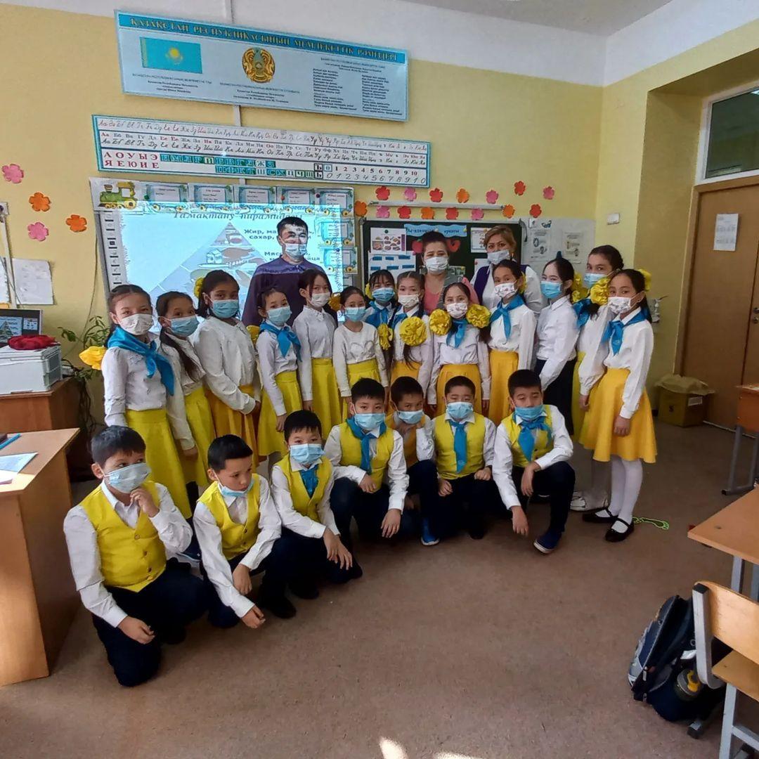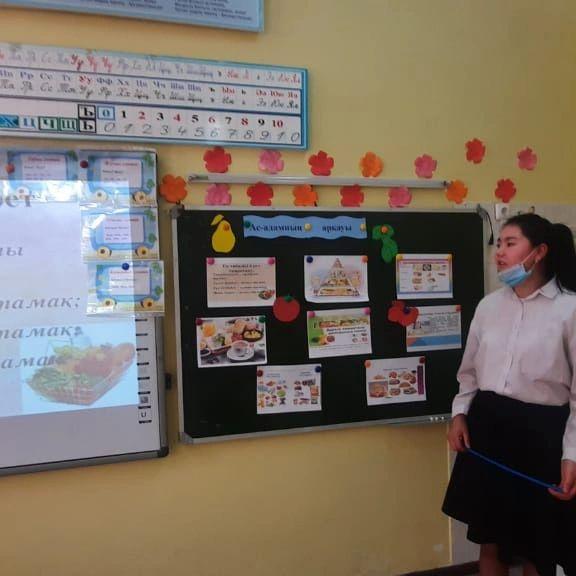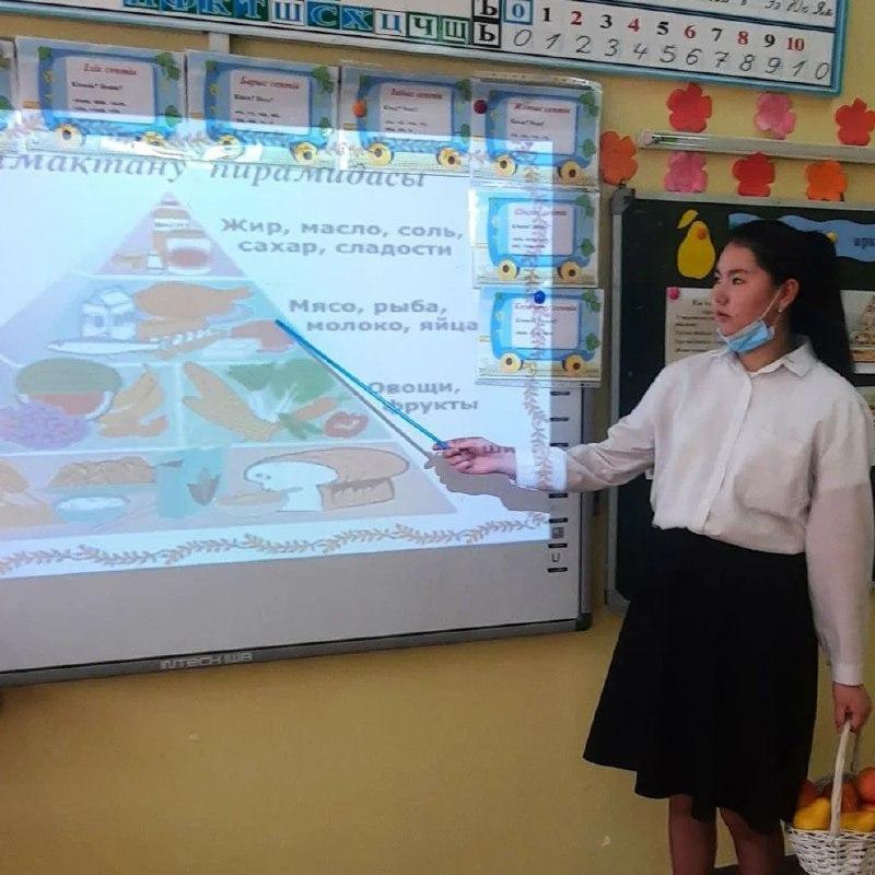 М.С.Әлиева және ҚазНұр гуманитарлық колледжінің 2 курс студенті- практикант Толқын Жарқынай 4а сынып оқушыларына "Ас - адамның арқауы" тақырыбында тәрбие сабағы өткізді.