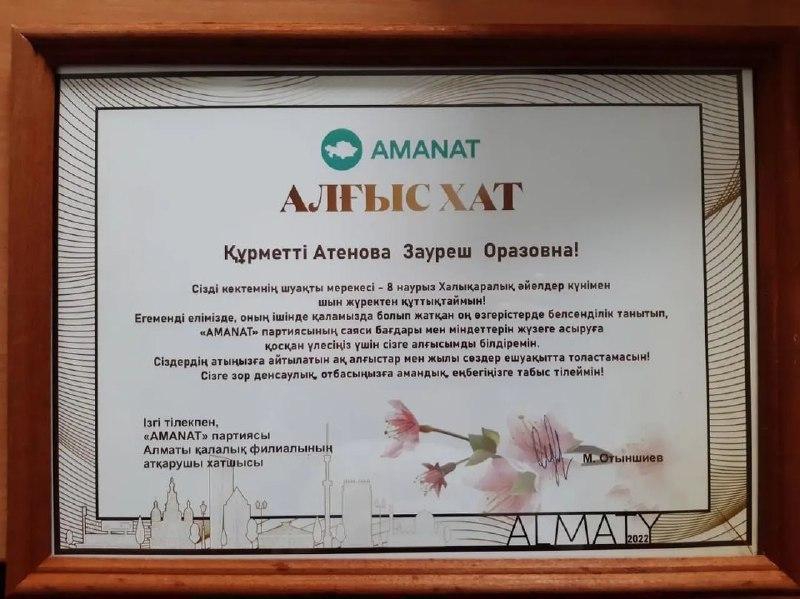 06 наурыз 2022 0 1 2 3 4 5 АЛҒЫС ХАТ AMANAT АЛҒЫС ХАТСізді көктемгі шуақты мерекесі 8-наурыз Халықаралық әйелдер күнімен шын жүректен құттықтаймын!Ізгі тілекпен "AMANAT" партиясы Алматы қалалық филиалының атқарушы хатшысы М.Отыншиев.