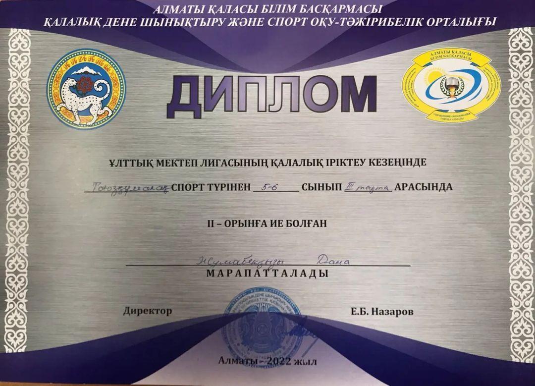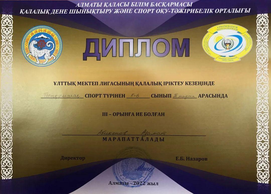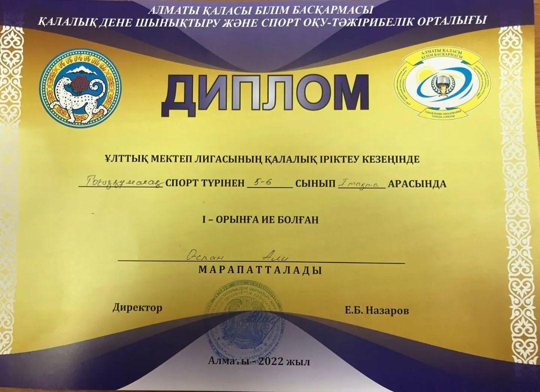 Ұлттық мектеп лигасының Алматы қалалық іріктеу кезеңінде Тоғызқұмалақ спорт турнирінен І - ші орынға ие болған ОСПАН АЛИ, ІІ - ші орынға АБИКЕНОВ АЗАМАТ, ІІІ- ші орынға болған ЖУМАБЕКОВА ДАНА, Алматы қаласы Білім басқармасының "Қалалық дене шынықтыру және спорт оқу- тәжірибелік орталығы" директоры Е.Назаров диплом және кубокпен марапаттады.