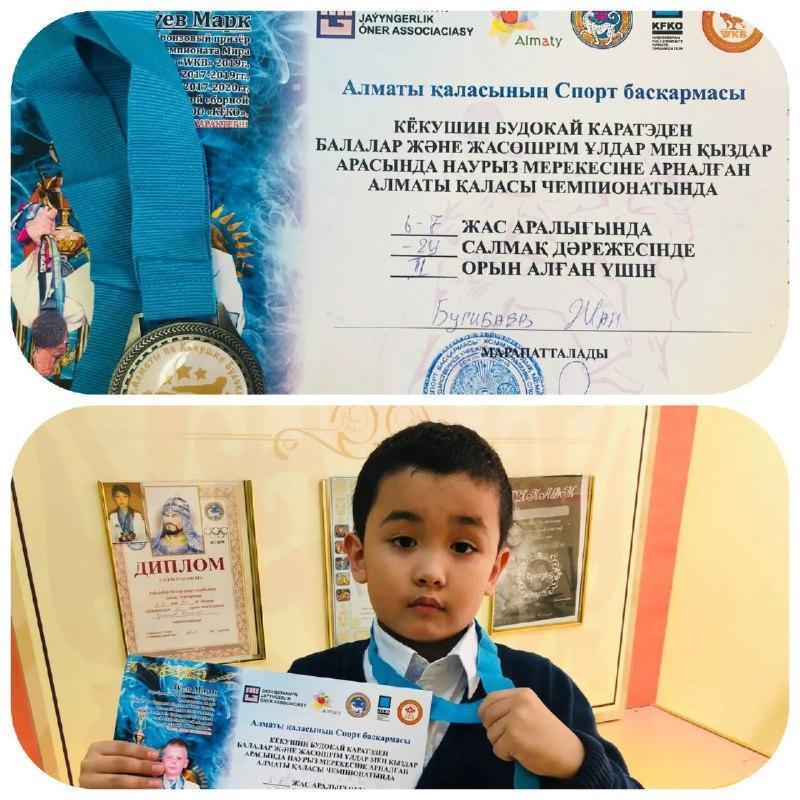 Алматы қаласының спорт басқармасы Кёкушин Будокай каратэден балалар және жасөспірім ұлдар мен қыздар арасында Наурыз мерекесіне арналған Алматы қаласы чемпионатында БУГЫБАЕВ ЖАН ІІ орын алғаны үшін дипломмен марапатталды. МОЛОДЕЦ! ЖАН! ТЫ НАШ ЧЕМПИОН!
