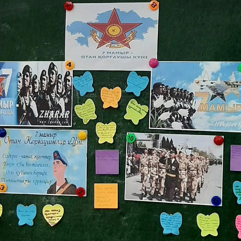 04 мамыр 2022 0 1 2 3 4 5 7 мамыр - Отан қорғаушылар күні! 7ә сынып. Сынып сағаты: 7 мамыр - Отан қорғаушылар күні!Мақсаты: Оқушыларға Отанымызды болашақта қорғау, Отанға қызмет ету әр Азаматтың міндеті екенін түсіндіру, патриоттық сезімін ояту.Жетекшісі Гулдей Бөгенбайқызы.