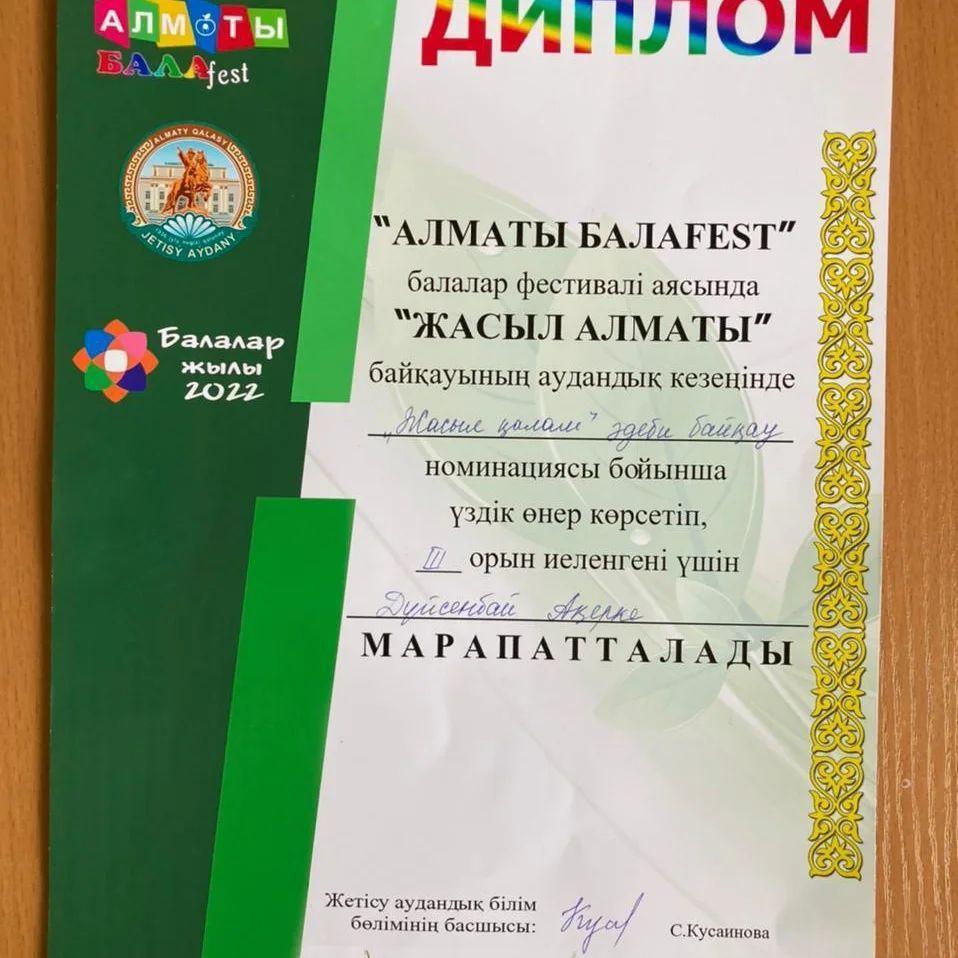 ДИПЛОМ ІІІ ОРЫН ДҮЙСЕНБАЙ АҚЕРКЕ "АЛМАТЫ БАЛАFEST" балалар фестивалі аясында "Жасыл Алматы" байқауының ауландық кезеңінде "Жасыл қалам" номинациясы бойынша үздік өнер көрсеткені үшін марапатталды. Жетекшісі Г И.Конысова.