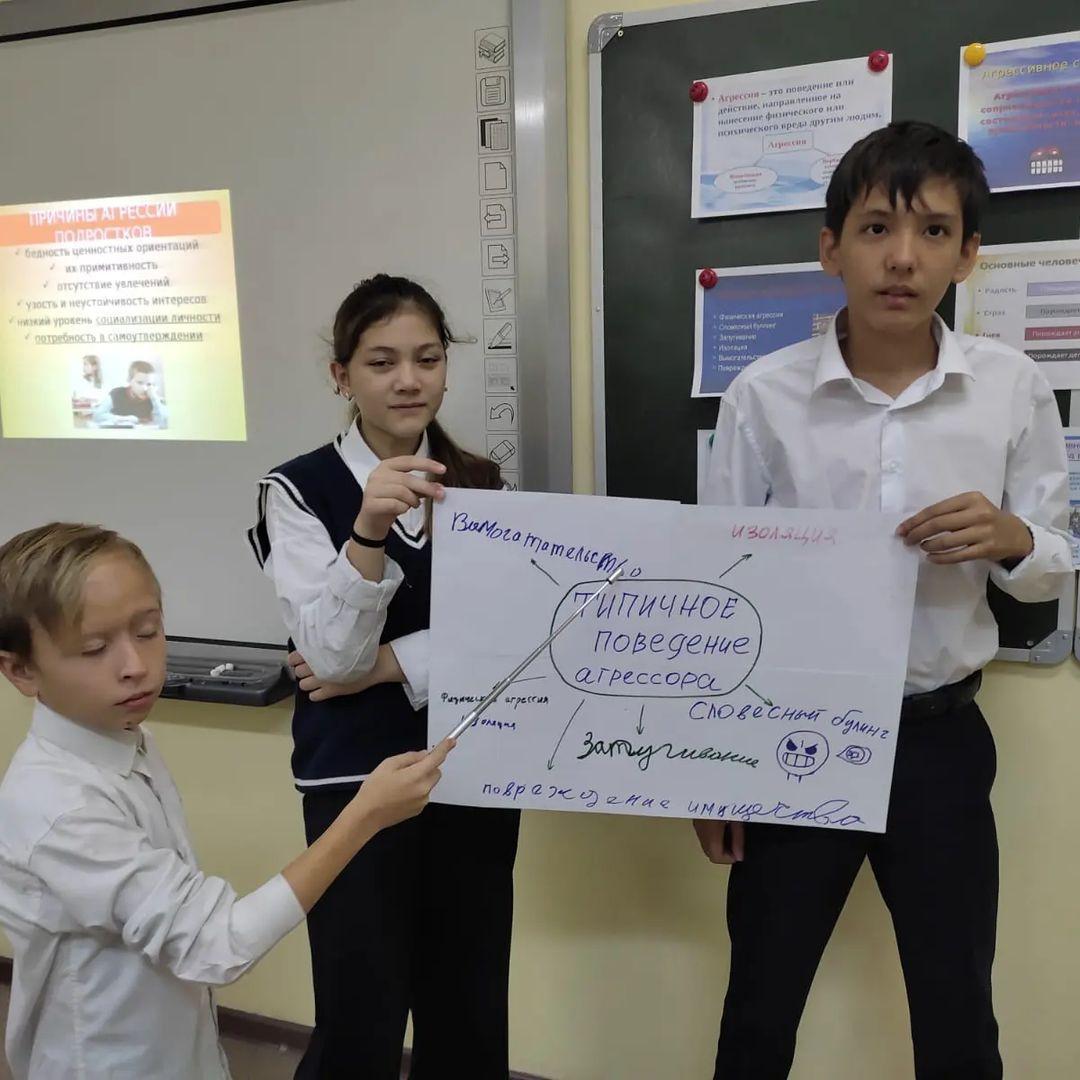 Жанна Жанатаевна в 8б классе проводила классный час на тему "Причины агрессивного поведения подростков". Цель: Профилактика агрессивного поведения, анализ учащимися своего и чужого поведения, развитие навыков саморегуляции, развитие коммуникативных навыков.