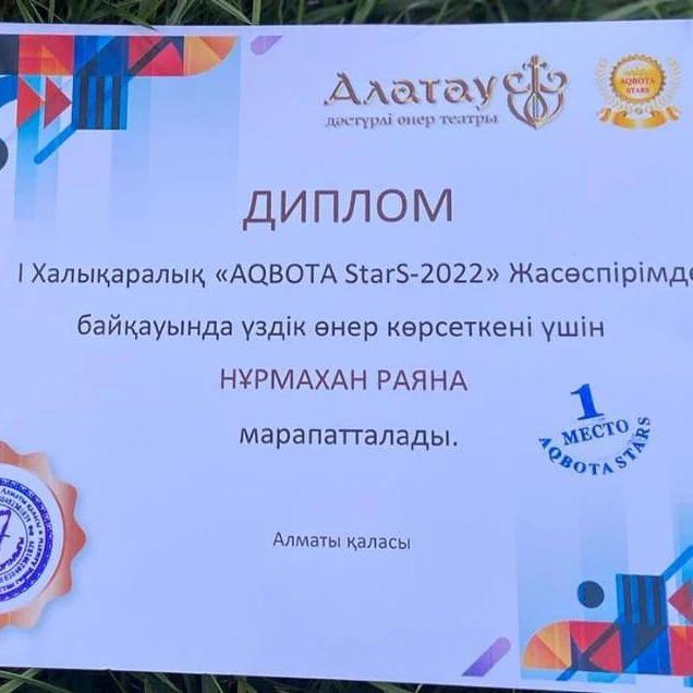 ДИПЛОМ І Халықаралық "AQBOTA STARS - 2022" Жасөспірімдер байқауында үздік өнер көрсеткені үшін НҰРМАХАН РАЯНА марапатталды. Көркемдік жетекшісі Л.Т.Кабдолдаева.