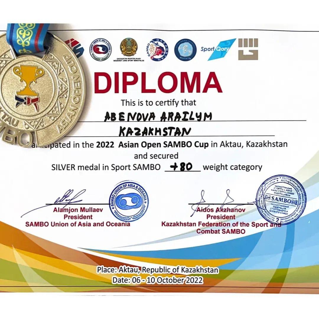 11 қазан 2022 0 1 2 3 4 5 DIPLOMA This is to sertify that ABENOVA ARAILUM DIPLOMAThis is to sertify thatABENOVA ARAILUMParticipated in the 2022 Asian Open Sambo Cup in Aktau, Kazakhstan and secured SILVER medal in Sport SAMBO +80 weight category.