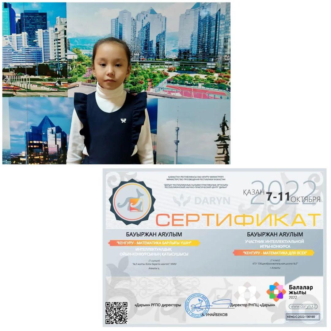 Участник интеллектуальной игры-конкурса «Кенгуру-математика для всех», организованной Дарынским Республиканским научно-практическим центром в г.Алматы с 7-11 октября 2022 года, Бауыржан Аяулым ученица 1 класса общеобразовательной школы № 3, награждена сертификатом.