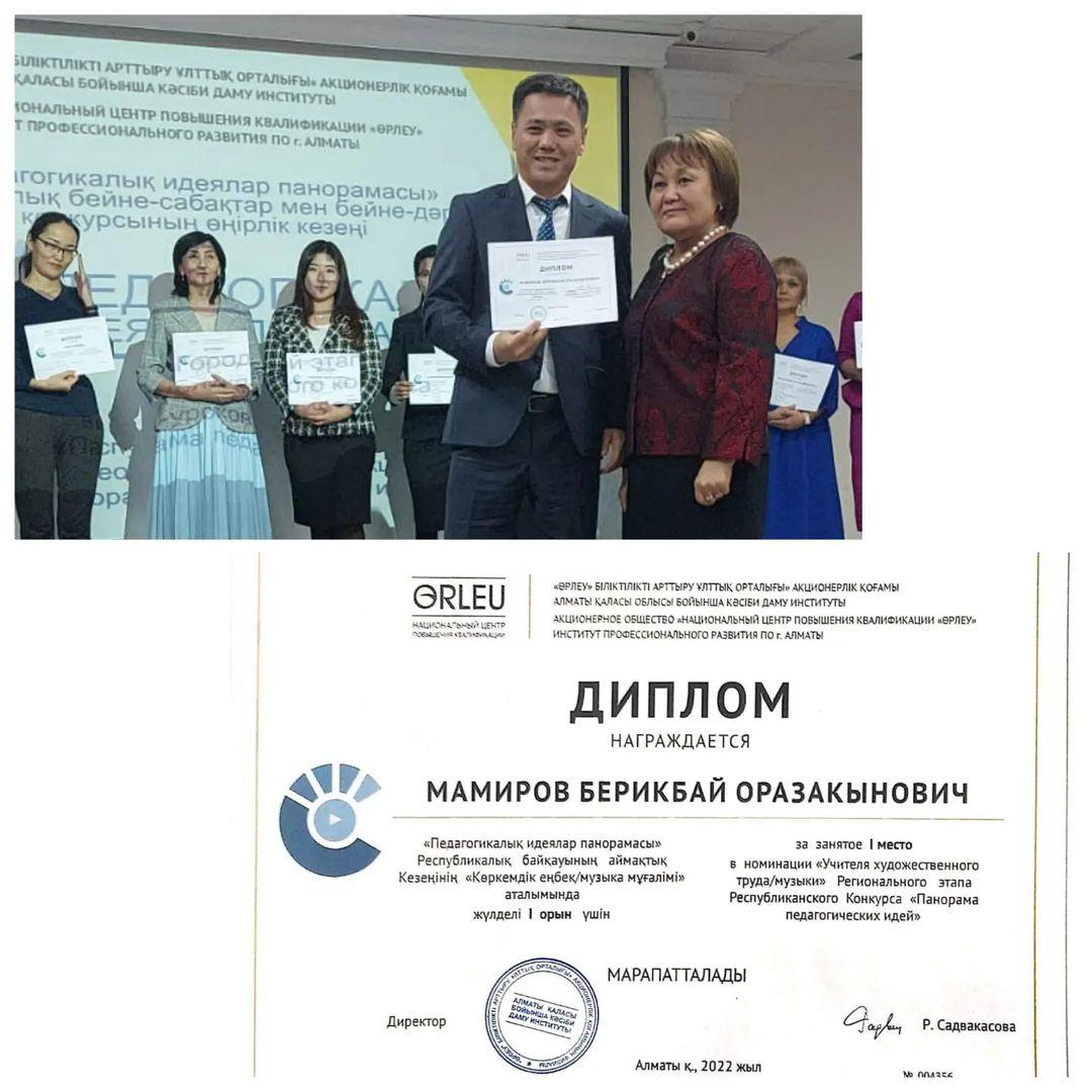 ДИПЛОМ МАМИРОВ БЕРІКБАЙ ОРАЗАКЫНОВИЧ "Педагогикалық идеялар панорамасы" Республикалық байқауының аймақтық Кезеңінің "Көркем еңбек/музыка мұғалімі" аталымында жүлделі І орын алды