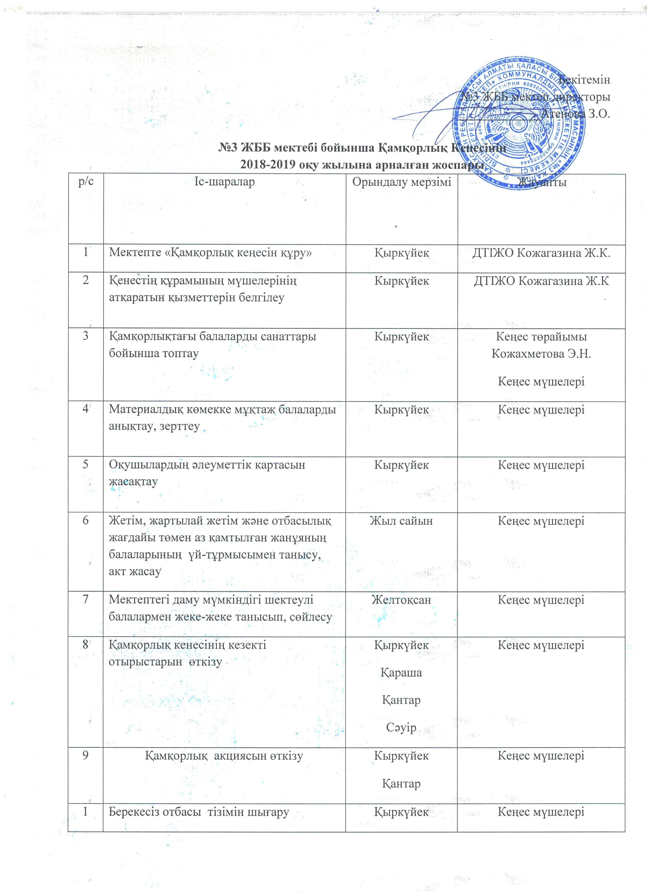 09 қыркүйек 2018 0 1 2 3 4 5 №3 ЖББ мектебі бойынша Қамқорлық Кеңесінің 2018-2019 оқу жылына арналған жоспары