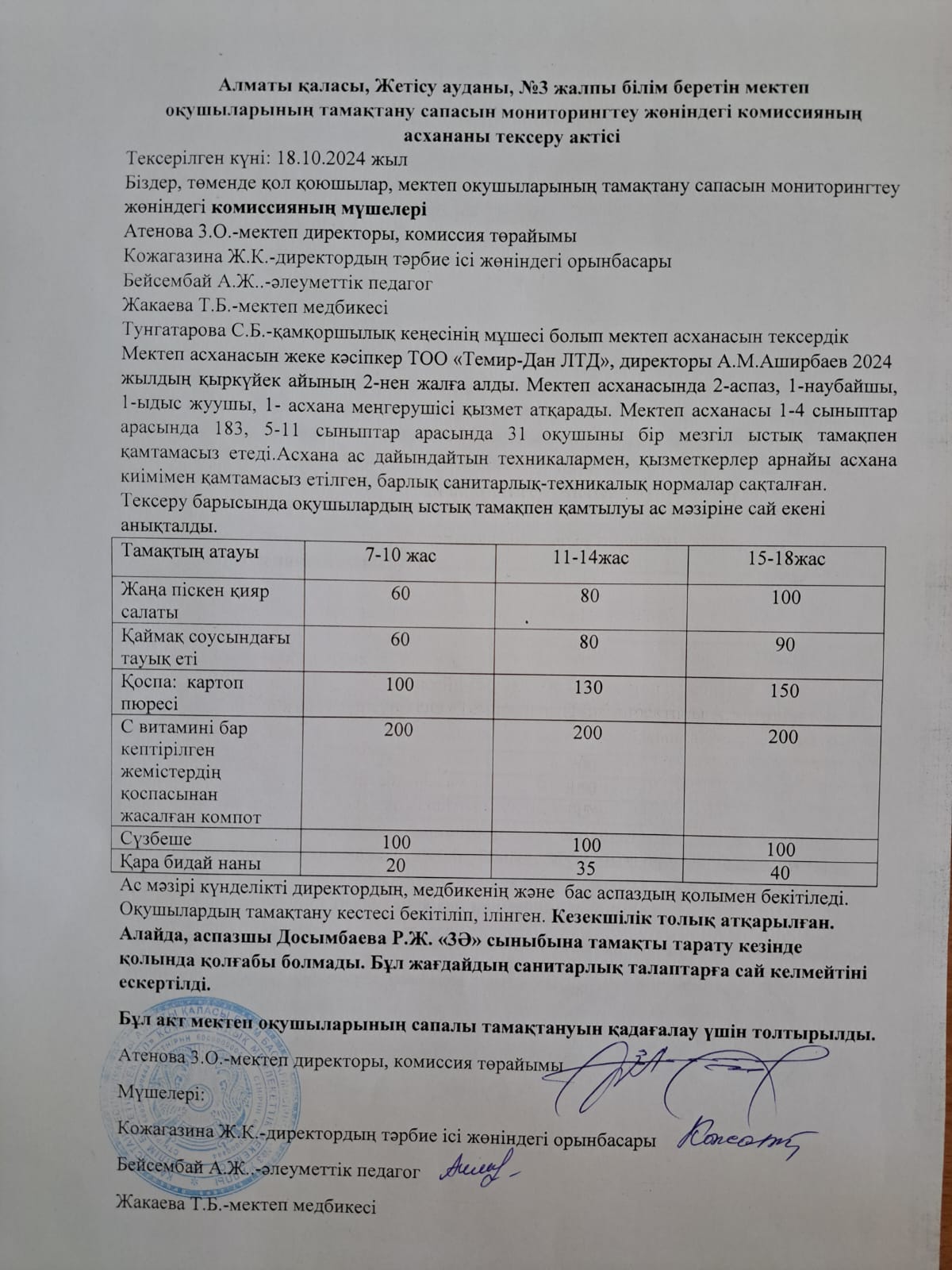 18 қазан 2024 0 1 2 3 4 5 Тамақтану сапасын мониторингтеу жөніндегі коммиссияның асхананы тексеру актісі