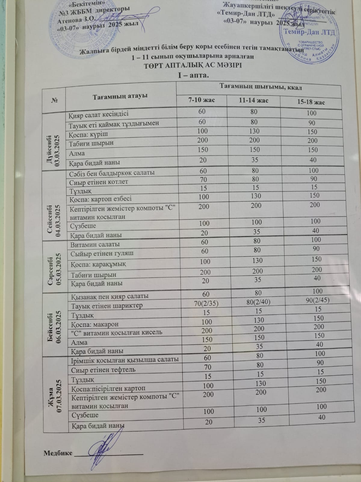 Бастауыш сынып оқушыларын бір мезгіл ыстық тамақпен қамту: ас мәзірі,бақылаудағы ас мәзірі,оқушылардың тамақтану сәті
