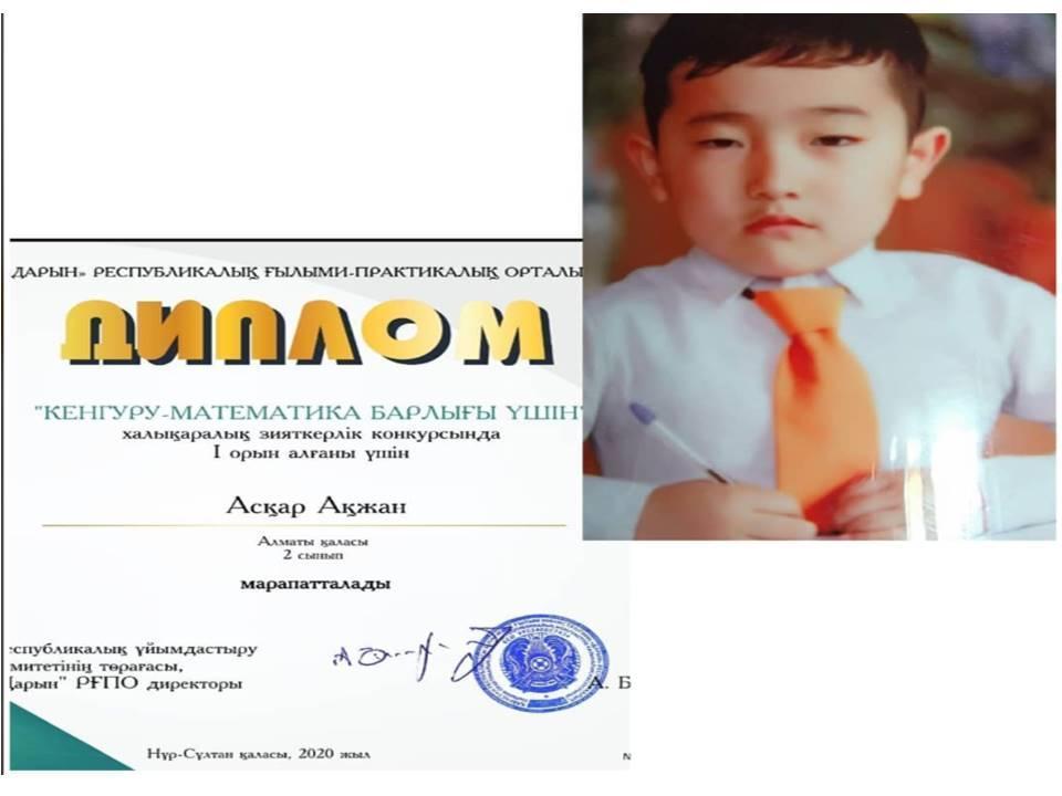 21 мамыр 2020 0 1 2 3 4 5 "Кенгуру - Математика барлығы үшін" халықаралық зияткерлік конкурсында АСҚАР АҚЖАН I орын алғаны үшін дипломмен марапатталды.