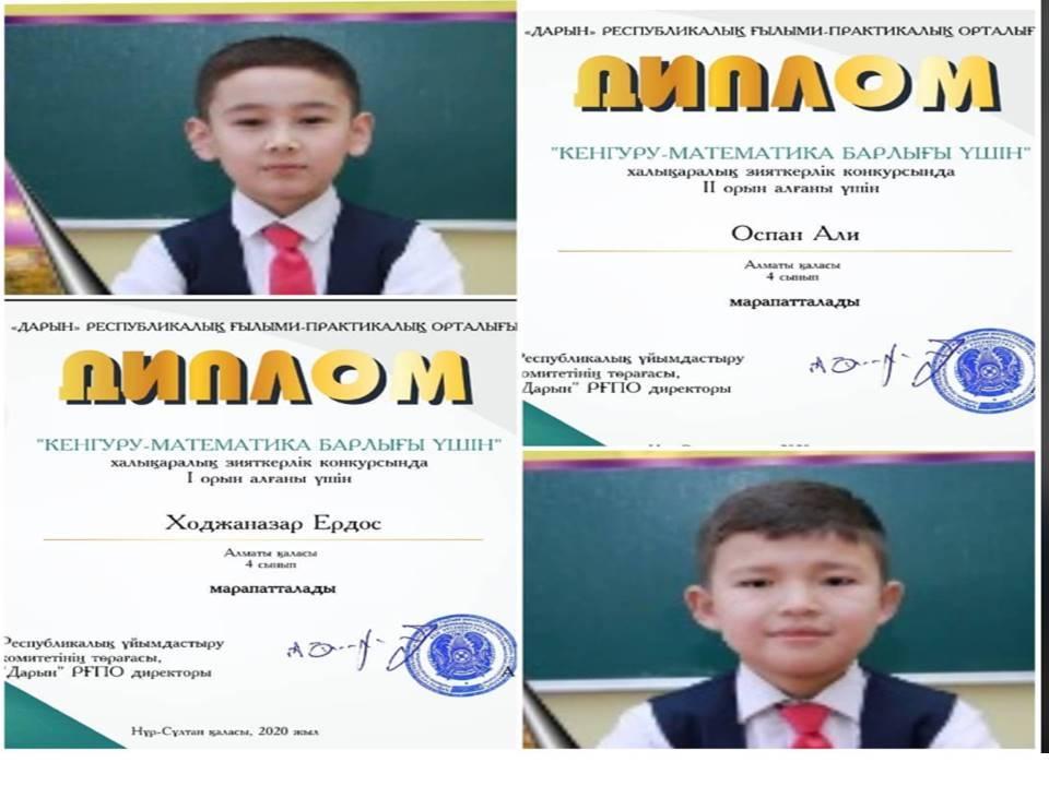 21 мамыр 2020 0 1 2 3 4 5 "Кенгуру - Математика барлығы үшін" халықаралық зияткерлік конкурсында ХОДЖАНАЗАР ЕРДОС I орын, ОСПАН АЛИ ll орын алғандары үшін дипломмен марапатталд